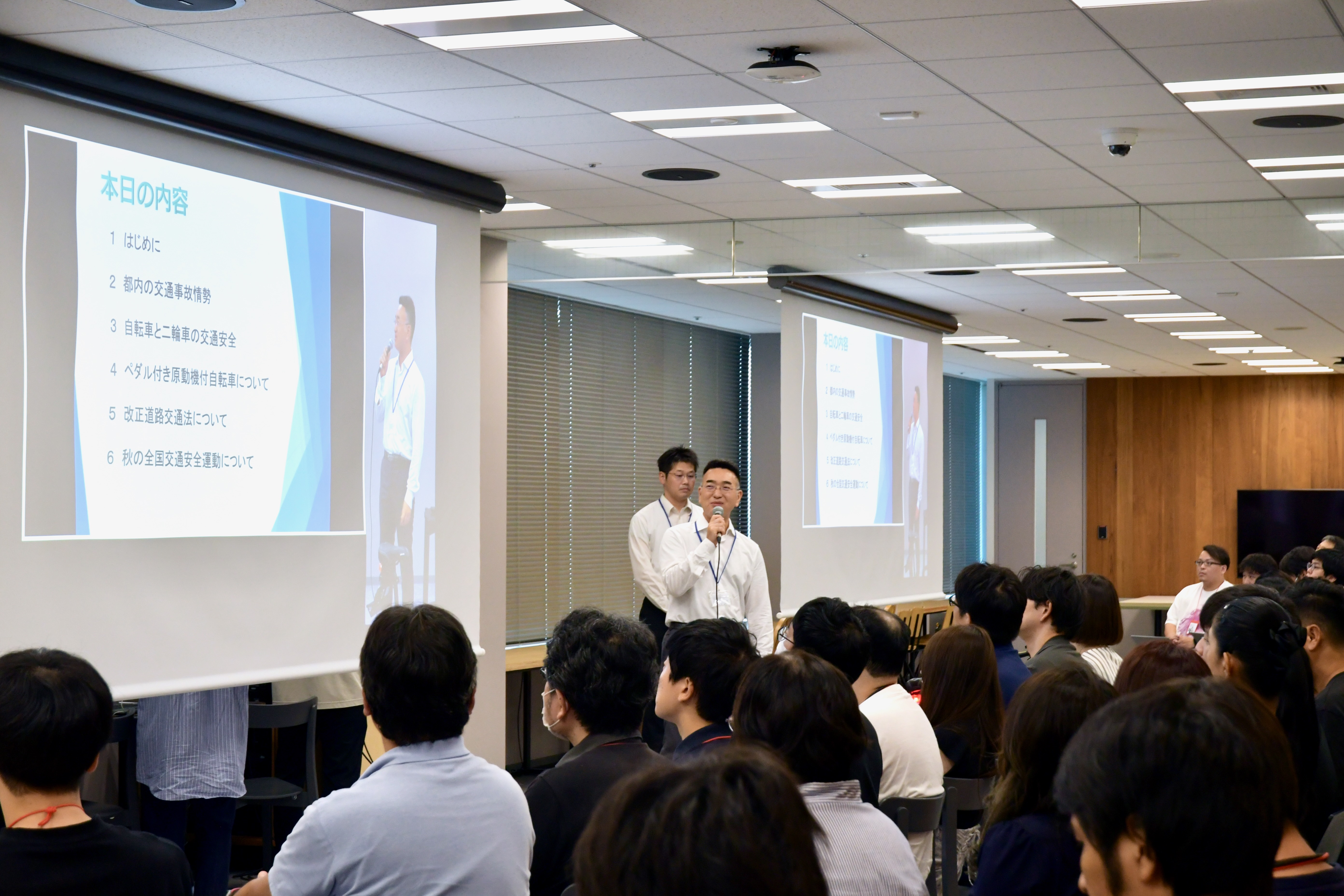 勉強会では、「東京都内での交通事故情勢」「道路交通法改正」「秋の交通安全運動」を中心に講義いただきました。特に今回の改正道路交通法施行における重点項目の一つであるペダル付原動機付自転車について、「ペダル付き原動機付き自転車と自転車の見分け方」や「法律上の車両区分」など、改めて仕組みや特徴、法規制などをご説明いただきご説明いただきました。