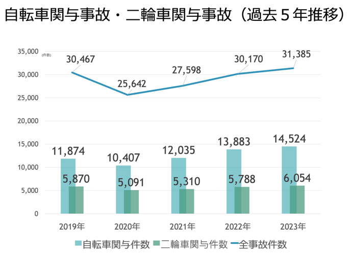 下記グラフを見ると、新型コロナウィルスの流行で交通事故件数は一時減少したものの、現在交通事故件数は増加に転じており、自転車・二輪車も同様の傾向にあります。