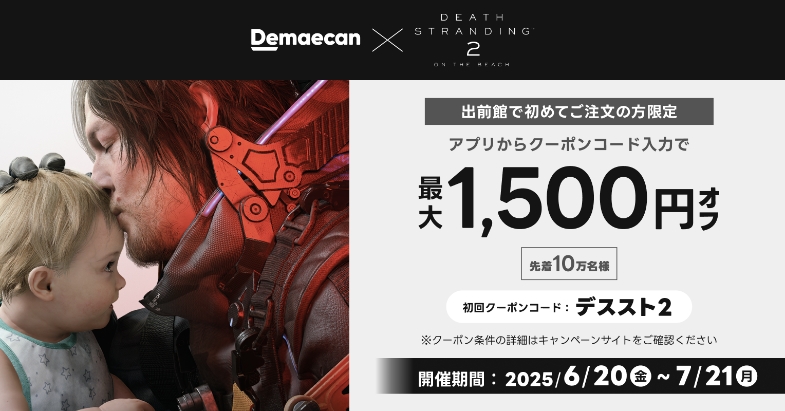 株式会社出前館は、運営する日本最大級のデリバリーサービス「出前館」において、株式会社コジマプロダクションより2025年6月26日(木)に発売予定のゲーム「DEATH STRANDING 2: ON THE BEACH」とのコラボキャンペーンを2025年6月20日(金)〜7月21日(月)に開催いたします。