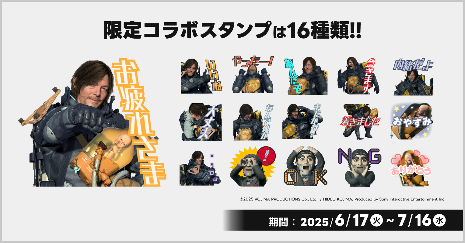 本コラボキャンペーンは、合計1,000名に「DEATH STRANDING 2」のオリジナルグッズが当たるエントリーキャンペーンや新規ユーザー限定クーポンの配布を行います。デリバリーを活用し、手軽に美味しい食事を楽しみながら、素敵なゲーム時間をお楽しみください!また、キャンペーン開始に先駆けて、本日6月17日(火)よりオリジナルLINEスタンプを配布いたします。