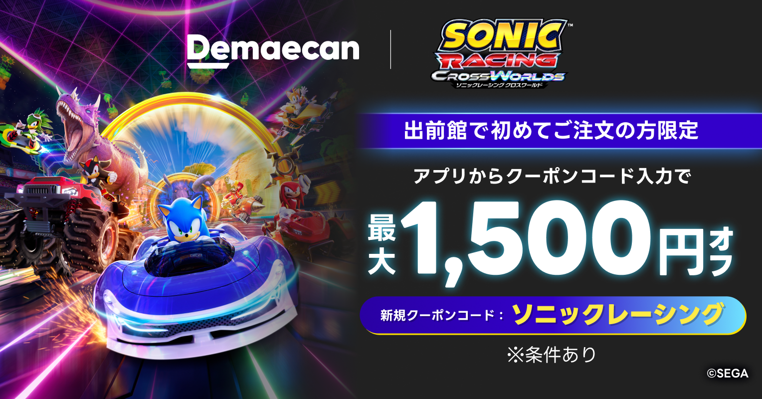 株式会社出前館は、運営する日本最大級のデリバリーサービス「出前館」において、株式会社セガより本日発売の『ソニックレーシング クロスワールド』とのキャンペーン「美味しさも、レースも、超音速でぶっちぎれ!」を、2025年9月25日(木)〜10月13日(月)に開催いたします。