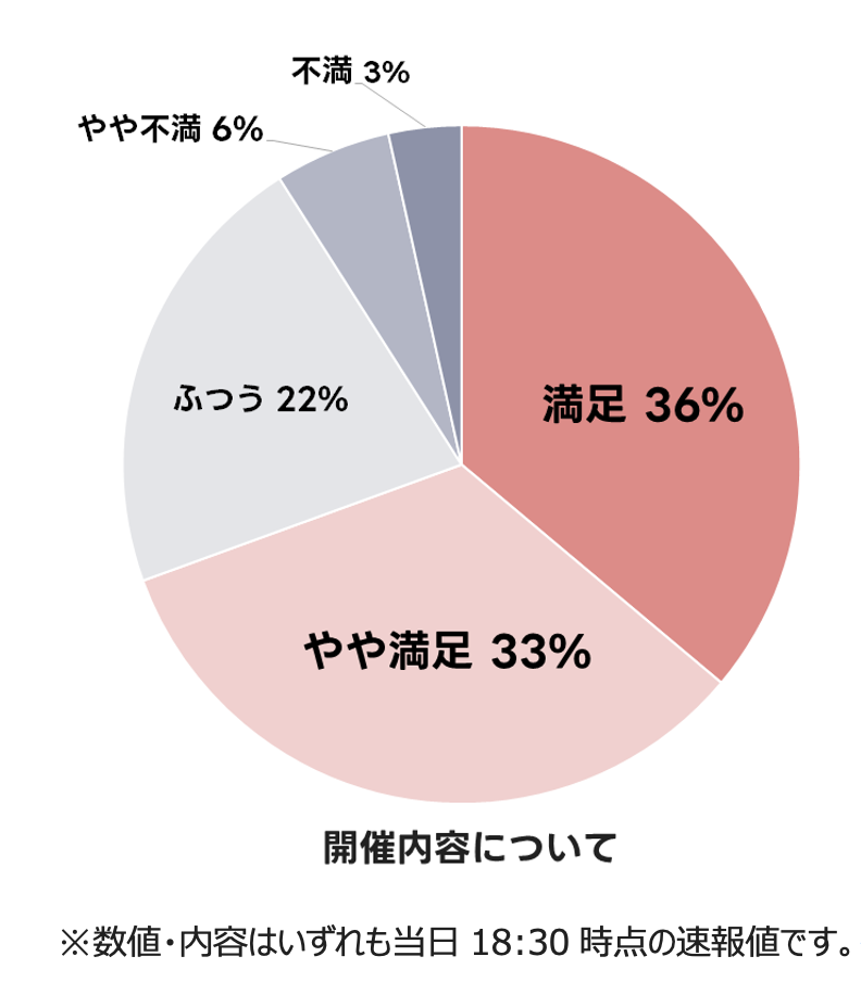 開催後のアンケートでは、約70%の方に「満足・やや満足」、次回の参加以降についても約80%の方より「次回も参加したい」というご回答をいただきました。
