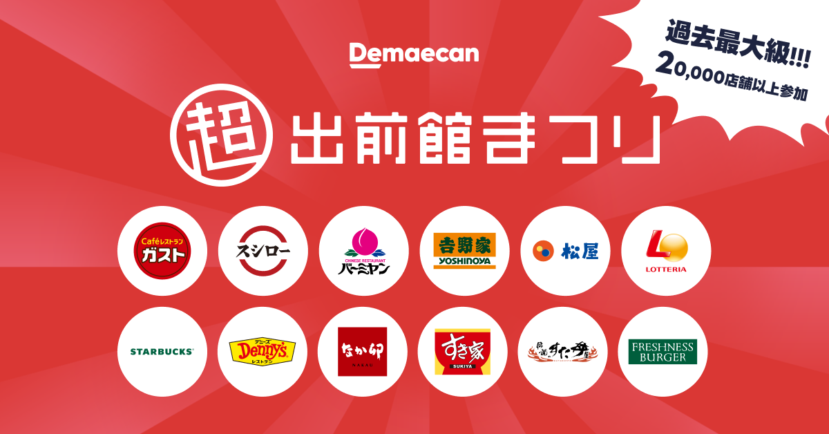 株式会社出前館は、運営するデリバリーサービス『出前館』における最大規模のキャンペーン「超出前館まつり」を2024年4月12日(金)より2週間開催いたします。
