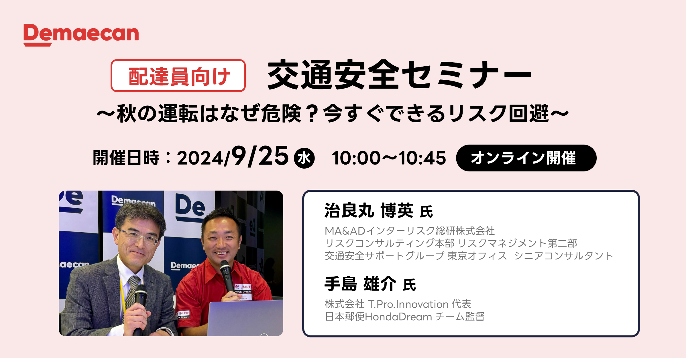 株式会社出前館は、出前館の配達員を対象に秋の交通安全セミナー「秋の運転はなぜ危険?今すぐできるリスク回避」(協力:三井住友海上火災保険株式会社)を、2024年9月25日(水)にオンライン開催いたしました。