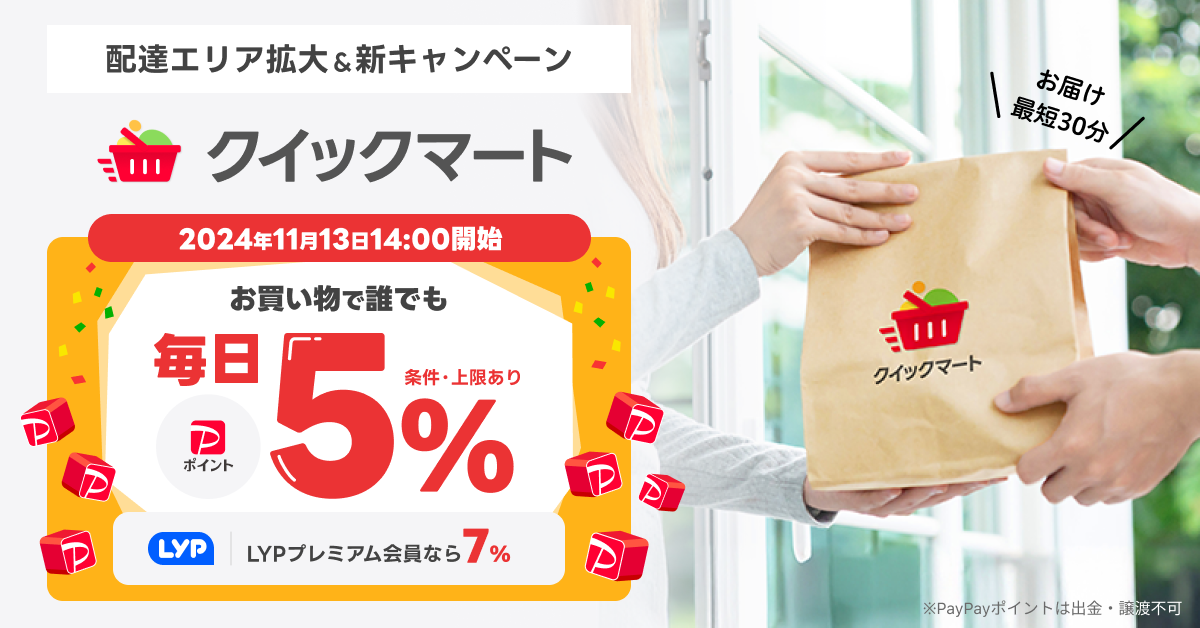 LINEヤフー株式会社(以下、LINEヤフー)と株式会社出前館(以下、出前館)は、生鮮食品や日用品などを最短30分で届ける「Yahoo!クイックマート」において、配達エリアを全国43都道府県に拡大しました。また本日より、「Yahoo!クイックマート」でお買い物すると「PayPayポイント」を対象金額の5%、「LYPプレミアム会員」は7%付与するキャンペーンを実施します(上限あり)。