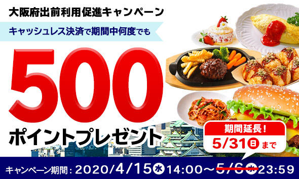 キャンペーン期間中、大阪府の対象店舗にキャッシュレス決済で注文し、お届け先が大阪府の方に500ポイントプレゼント